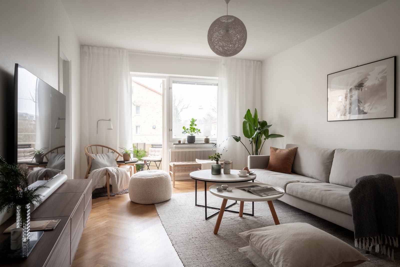 Från köket leds du vidare in i vardagsrummet genom en öppen passage som förstärker den sociala känslan. Här flödar ljuset in genom stora fönster i västerläge och skapar ett luftigt och inbjudande rum. Den vackra fiskbensparketten ger karaktär och tillsammans med de vita väggarna bildas en tidlös och elegant miljö. Rummet rymmer enkelt en större soffgrupp och för den som önskar finns även plats för ett matbord. Härifrån nås den generösa balkongen som blir en självklar förlängning av bostaden under årets varmare månader. Lägenheten är belägen på våning ett men i och med att huset är placerat i en uppförsbacke är känslan i praktiken våning två. Härlig utsikt över grönskan! Området är lugnt och stillsamt, omringat av natur och beläget på en återvändsgata.
