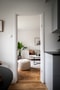 Direkt till vänster öppnar det stilfullt renoverade köket från 2024 upp sig. Modernt kök med ljusgrå skåpsluckorna med nätta beslag, och den svarta bänkskivan som elegant går upp en bit på väggen skapar en snygg kontrast. Köket är genomtänkt planerat med förvaring och arbetsytor på två sidor, både över- och underskåp samt inbyggda hyllplan som fungerar som en dekorativ detalj. Under överskåpen ger belysningen ett behagligt ljus, perfekt både för matlagning och kvällstid. Intill fönstret, med utsikt mot grönskan utanför, finns en naturlig plats för matbord med plats för fyra – en trivsam hörna för både vardagsmiddagar och långa frukostar. Köket är fullt utrustat med kyl/frys, ugn, spis, inbyggd mikro och diskmaskin. Parkettgolv och vita väggar knyter fint an till bostadens helhet.