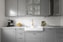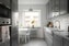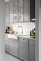 Till höger ligger det stilfulla köket i sobra grå toner med vackra guldiga beslag som sätter en elegant ton. Den ljust grå bänkskivan och det vita stänkkaklet bildar en tidlös kombination. Här erbjuds gott om förvaring bakom de släta grå luckorna och generösa arbetsytor som gör matlagningen till ett nöje. Köket är utrustat med integrerade vitvaror, induktionshäll med köksfläkt och dessutom en smart inbyggd tvättmaskin, praktiskt och snyggt dolt.