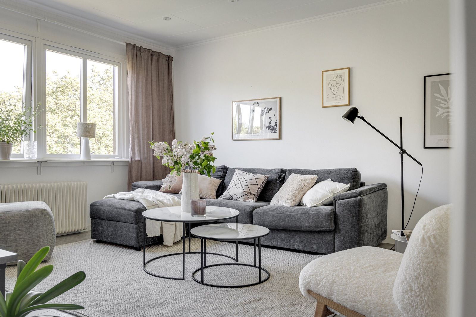 Genomgående fint laminatgolv och målade väggar. Köket går i moderna och stilsäkra färgval med mörk bänkskiva, gråa luckor med struktur som ger den extra känslan av lyx till köket. Här finns plats för ett matbord invid fönstret. Vardagsrummet ligger i fil med köket och har gott om plats för soffgrupp med tillhörande tv-möbel samt större matplats. Här slås man av ljuset som sträcker sig in i bostaden. De större sovrummet har en platsbyggd skjutdörrsgarderob och gott om plats för en större säng. De mindre sovrummet passar perfekt som barnrum, gästrum eller varför inte som kontor. Sovrummen ligger med ett lugnt läge mot Lambergsgatan. Badrummet går i snygga gråa toner och här finns plats för att sätta in en tvättmaskin om så önskas.