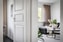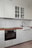 Vidare till vänster in i bostaden ligger köket som renoverades 2020. Det är modernt med gråa luckor och vitrinskåp. Utrustningen består av spishäll, inbyggnadsugn, inbyggnadsmikro, diskmaskin, köksfläkt samt kombinerad kyl och frys. Invid fönstret finns plats för matbord för ca 4-6 personer. Vita väggar och på golvet ligger fint laminat.