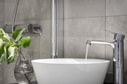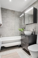 Slutligen finner man badrummet från hallen som renoverades 2020. Det är helkaklat med beige klinkergolv och grått kakel på väggarna. Utrustningen består av toalett, handfatskommod, spegelskåp med belysning, badkar med dusch och handdukstork.