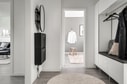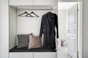 Inbjudande och rymlig hall som leder vägen vidare till samtliga rum. Väggarna är ljusa och på golvet ligger fint laminat. Till höger finns plats för avhängning och förvaring.