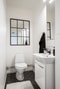 Intill ett av sovrummen finns även en gästtoalett med wc och handfat med kommod. Klinkergolv och vita väggar.