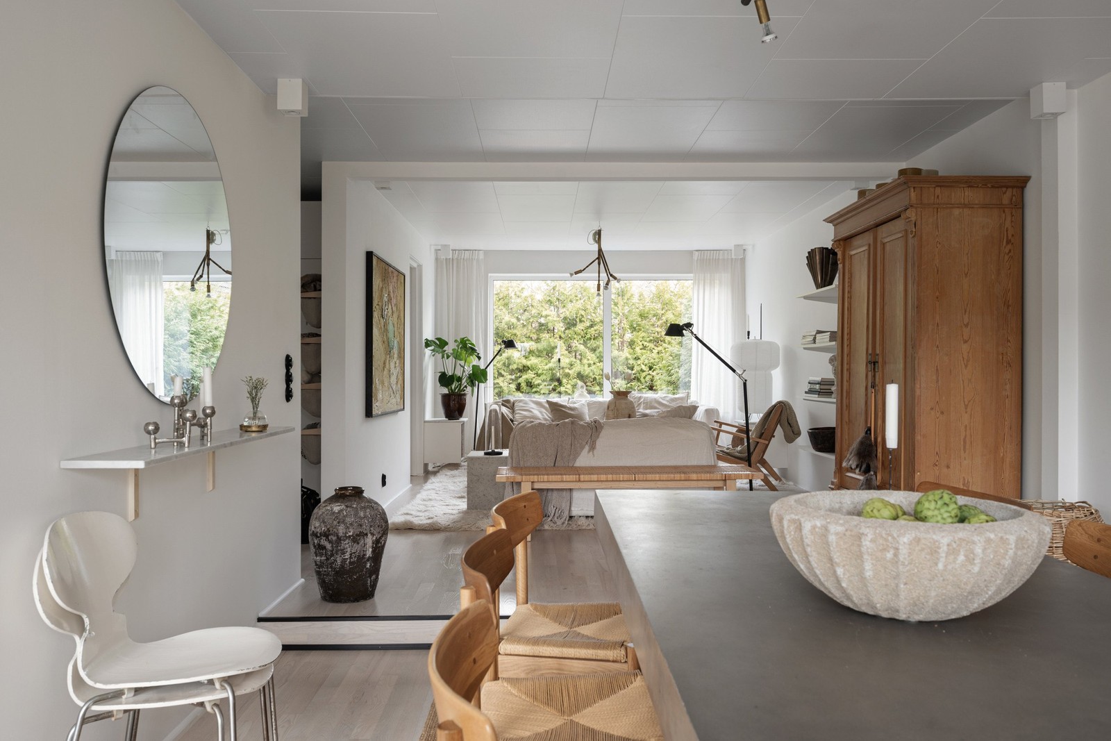 Genomgående i huset ligger ljusa golv som tillsammans med de neutrala färgvalen skapar ett enhetligt och stilrent uttryck.
