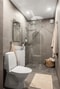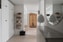 På entréplanet finns även ett snyggt badrum med stilrena materialval, kakel och klinker i behagliga toner, tvättavdelning samt dusch – en modern och elegant miljö.