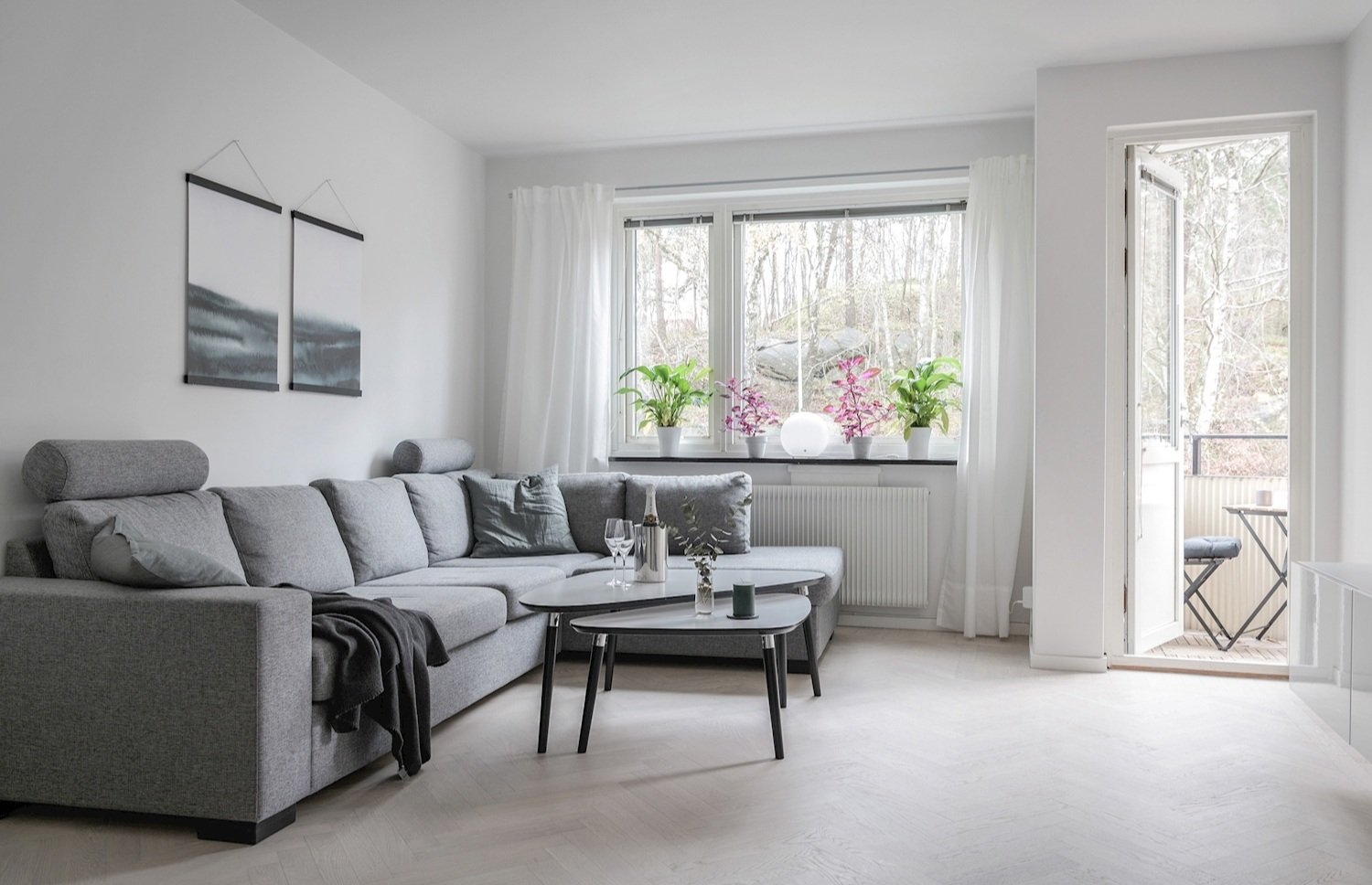 Vardagsrummet tangerar, tillsammans med den angränsande balkongen, att bli platsen för det sociala umgänget. Stora fönsterpartier släpper in rikligt med ljus och här finns möjlighet till såväl soffgrupp som arbetsutrymme. På golvet ligger en vacker originalparkett som blivit behandlat med en vitpigmenterad hårdvaxolja och väggarna är vita. Utgång till balkongen i uppskattat västerläge.