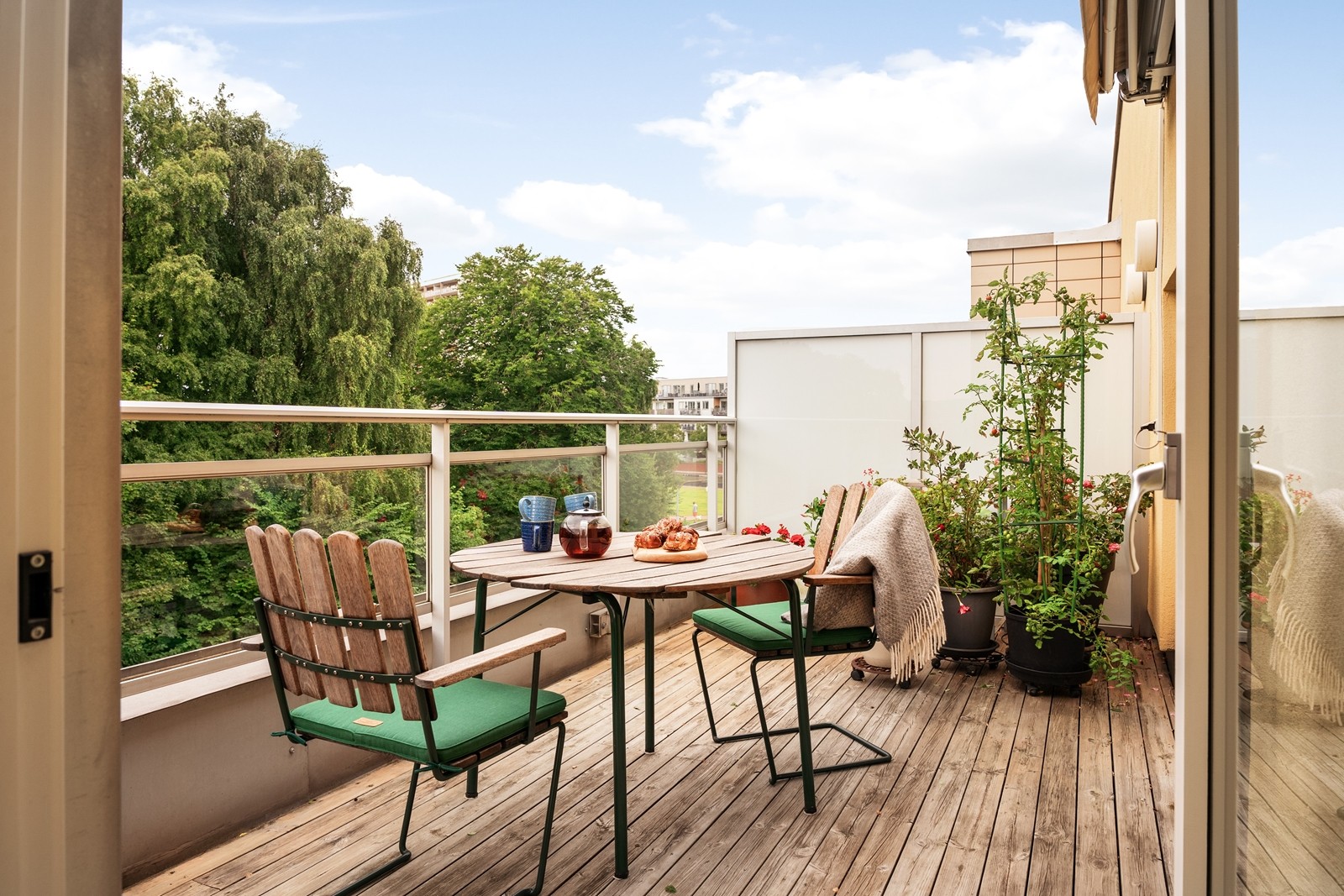 Spatiös takhöjd, öppen planlösning och terrass i västerläge
