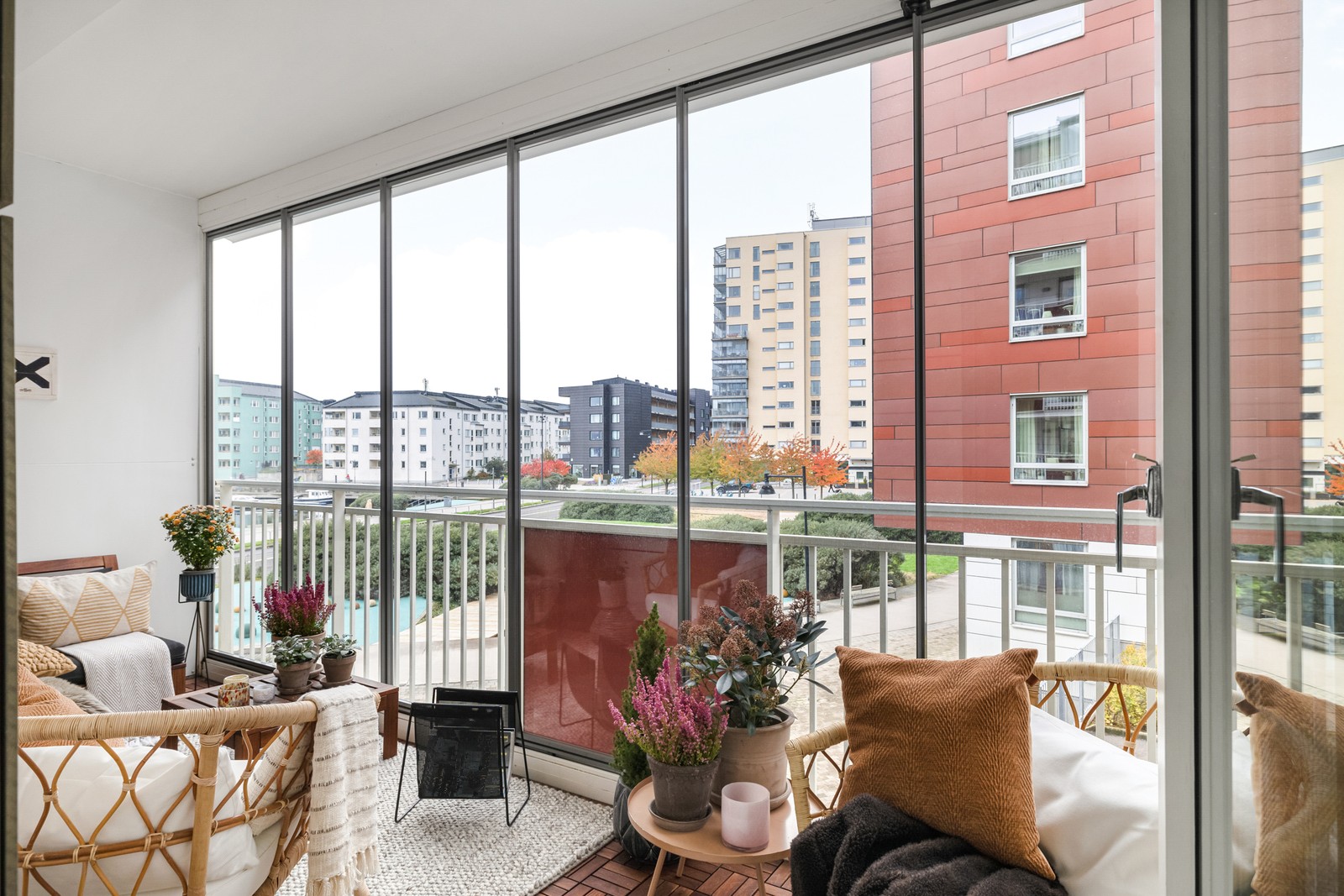 Modern lägenhet med inglasad balkong och utsikt över Sannegårdshamnen