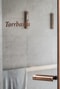 Till vänster i entrén ligger badrummet. Snyggt kaklat med stora vita liggande kakelplattor på väggarna och stenimiterat klinker på golvet. Vikväggar av glas vid duschen. Brett tvättställ med underskåp samt stor spegel med belysning. I taket sitter infällda spotlights. I badrummet finns även en kombinerad tvättmaskin och torktumlare. Ovan denna finns en praktisk bänk och förvaringsskåp. Komfortvärme i golvet.