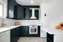 Modernt kök med öppen del mot vardagsrummet som låter ljuset flöda rakt genom bostaden. Gott om skåp och luckor i mörk nyans. Vitt kakel och arbetsbänk skapar en fin brytning. Maskinell utrustning bestående av spis med häll, fläktkåpa, kombinerad kyl och frys samt diskmaskin. Ovanför diskbänken sitter ett fönster som släpper in ljuset och bidrar med trivsel. Köket har även en köksö för extra arbetsyta.