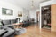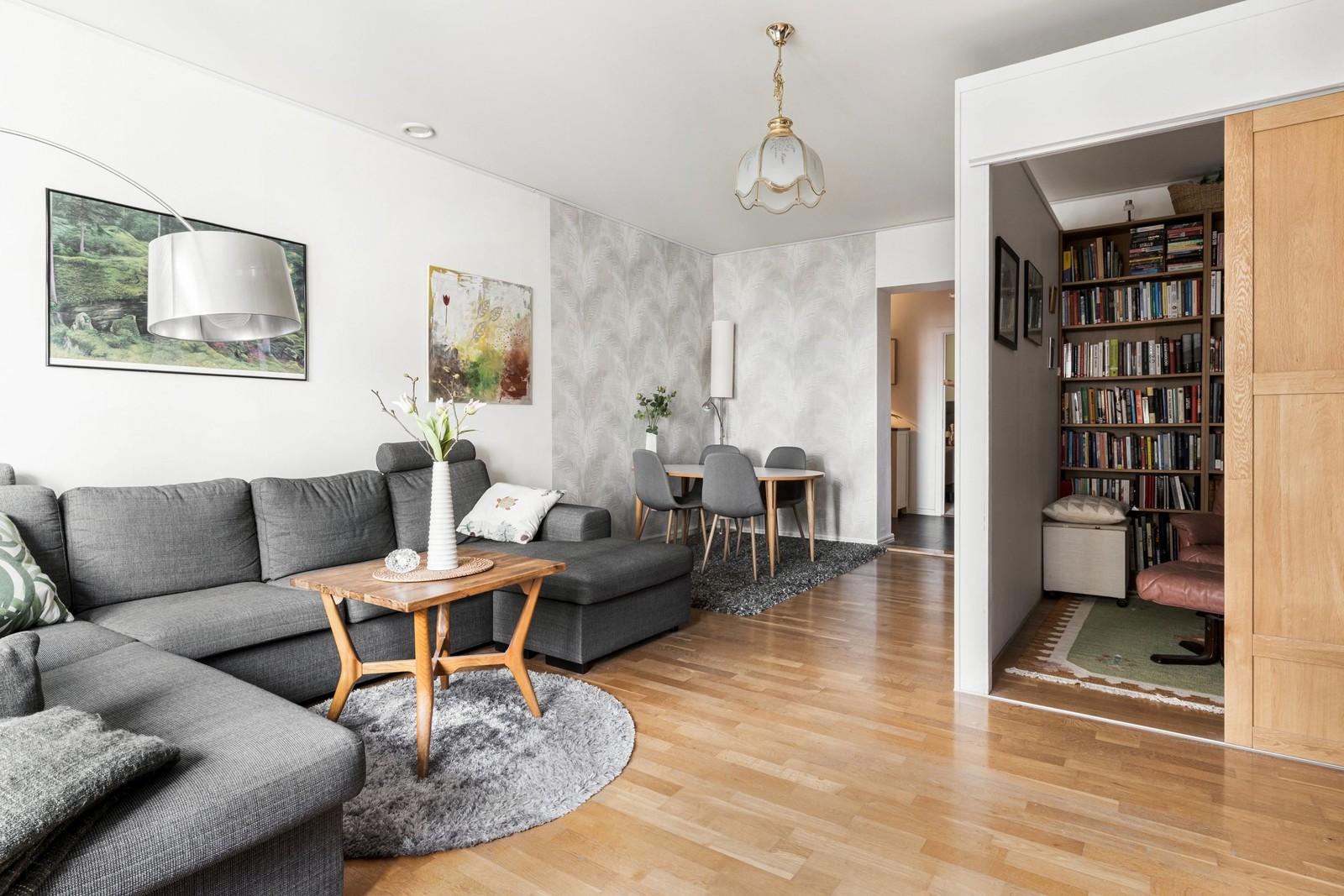 Ett rymligt och lättmöblerat vardagsrum med en naturlig uppdelning mellan soffdel och matplats. Här finns höga fönster ut mot Friggagatan som släpper in mycket ljus, och de djupa fönsternischerna ger en extra charm. Golvet är i vacker ekparkett och väggarna är målade och tapetserade för en modern och trivsam känsla. Ett inbyggt kontor ger smart funktionalitet för den som arbetar hemifrån eller behöver ett avskilt utrymme.