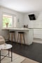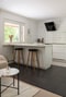 Köket är ljust och inbjudande med vita luckor, matchande kakel och bänksskiva som skapar ett harmoniskt helhetsintryck. Den generösa köksön fungerar både som matplats och extra arbetsyta, ett självklart nav i bostaden för såväl vardag som sociala tillställningar. Här finns integrerade vitvaror i form av kyl/frys och diskmaskin, samt en rostfri ugn och svart induktionshäll. Gott om både arbetsytor och förvaring gör köket till ett nöje att vistas i oavsett om du lagar middag eller bara umgås.