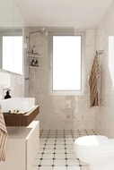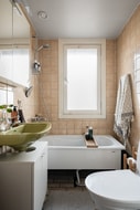 Innan du lämnar bostaden tittar du in i bostadens helkaklade badrum. Väggar och golv är täckta med kakel och klinker i beige nyans. Inredningen består utav wc, badkar och dusch, charmigt handfat med kommod och vägghängt spegelskåp för förvaringen. Ljuset lyser in från fönstret som också ger möjlighet att vädra.