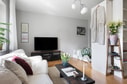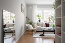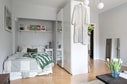 Välkomnas vidare in i det härliga vardagsrummet till vänster. Här får du goda möjligheter att inreda precis så som du vill ha det. Det inryms enkelt en mysig soffhörna med tillhörande möblemang och längs ena väggen finns plats för en skrivbordshörna om så önskas. Sängen får sin självklara plats i ena hörnet och du kan skapa en alkov genom att avskilja soffa och säng med hjälp av garderober. I kombination med det härliga ljuset som strålar in genom fönstren, takhöjden och väggarna i grå nyans ges en härlig känsla av hem.