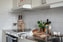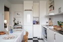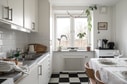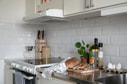 Tillbaka genom hallen möts vi av köket där de vita skåpsluckorna med nätta beslag kombineras fint med vitt kakel som följer väggen ovan bänkskivan. På golvet vilar ett riktigt charmigt golv i schackrutor. Köksbordet får en naturlig plats med sittplats för fyra personer. Utrustningen består av kyl/frys, ugn, spis och fläkt.