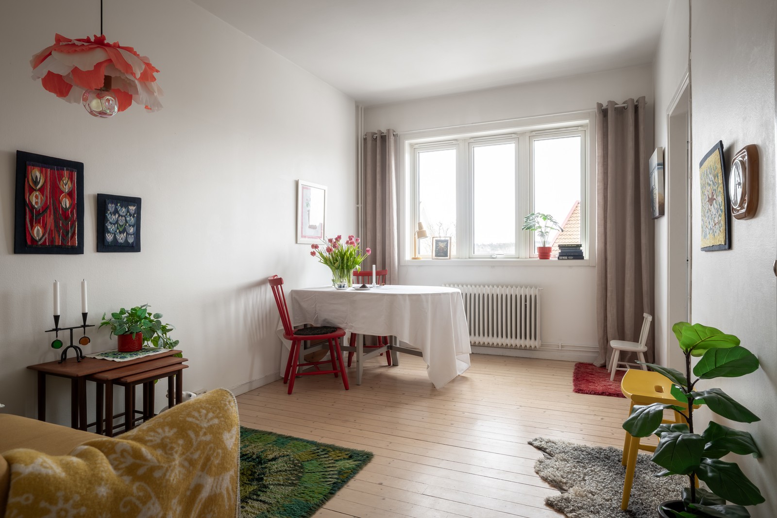 Från hallen når du vardagsrummet där du med enkelhet får plats med både soffgrupp och matgrupp. Dagsljuset lyser in och skapar en fin känsla i hela rummet! Garderob finns även här för din förvaring.