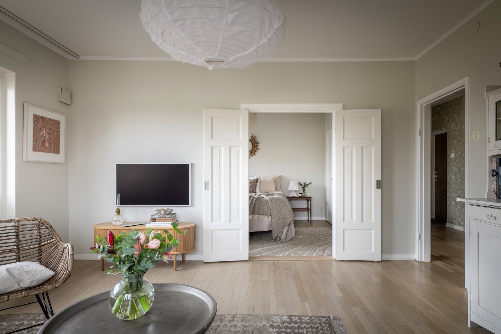 Bostadens själ finns i det strålande vardagsrummet, där balkongfönster och gavelläget låter ljuset flöda in från tidig morgon till eftermiddag. I direkt anslutning ligger ett av rummen i fil – perfekt som elegant matsal eller rofyllt sovrum – vackert inramat av de eleganta dubbeldörrarna som förhöjer den klassiska atmosfären. Den sydvända balkongen blir en självklar favoritplats för morgonkaffet, eftermiddagsvilan eller kvällslugnet. Det genomgående ljusa parkettgolvet ger bostaden en varm och äkta karaktär, och både köket och badrummet är smakfullt renoverade. Båda sovrummen erbjuder bra storlek och gör bostaden flexibel för både paret, den mindre familjen eller för dig som bara vill bo rymligt och praktiskt.