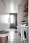 Den öppna och ljusa hallen leder oss vidare in mot lägenheten. Till vänster finner vi lägenhetens stora badrum samt klädvårdsdel. Badrummet är vackert inrett med stilrent kakel och klinker i vitt och grått. Här finns en större duschdel. Handfat, WC, handdukstork som gör handdukarna både varma och torra. Här finns även klädvårdsdelen i form av tvättmaskin (2017), torktumlare (2008). Hyllor som är bra för handdukar och övrig förvaring som skapar ordning och reda. En praktisk bänk i massiv trä omsluter fint arbetsytorna.