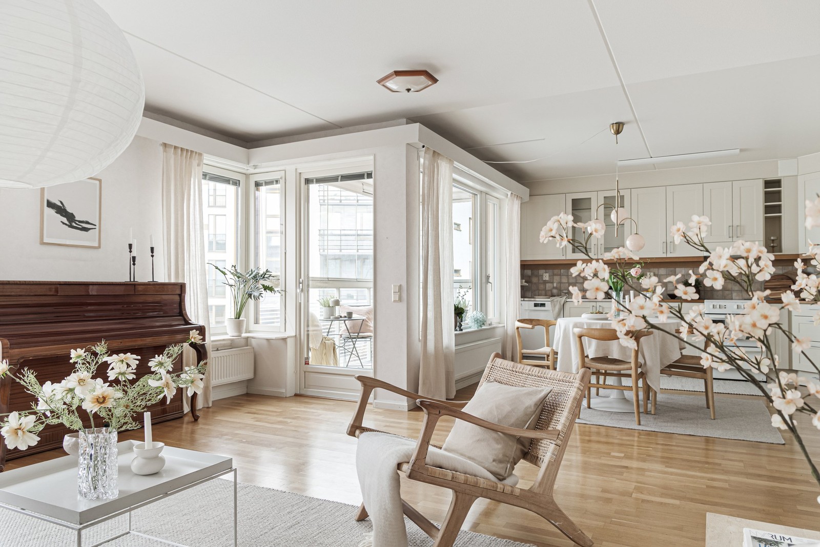 Den anslutande vardagsrumsdelen badar i ljus tack vare sina generösa fönsterpartier. Rummet erbjuder gott om utrymme för en stor soffgrupp, tv-möbel och andra möbler efter behov. Härifrån når man även den inglasade balkongen som bjuder på eftermiddags- och kvällssol. Balkongen fungerar som ett extra rum som kan nyttjas stora delar av året — perfekt för avkoppling, odling eller sociala stunder.