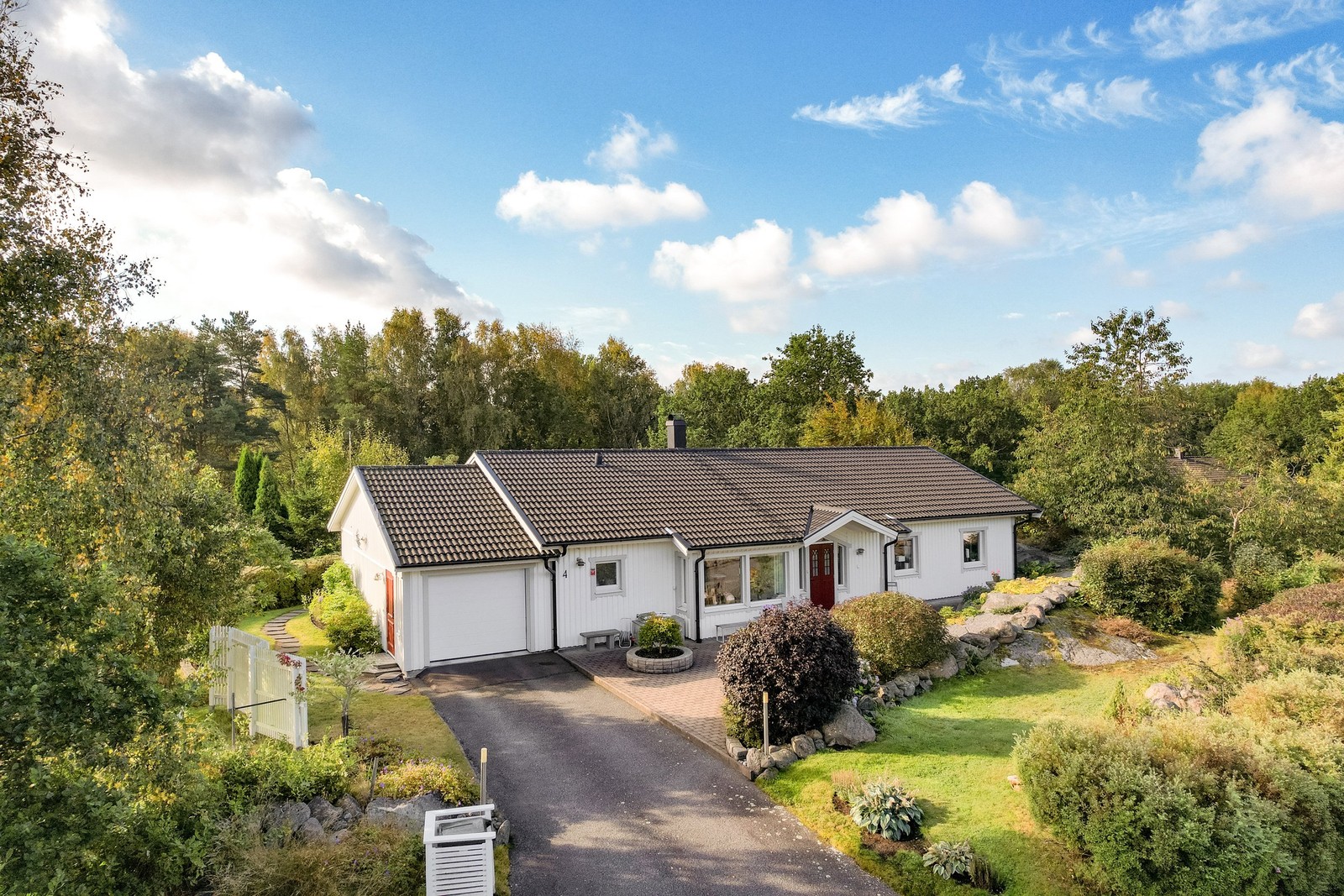 Välskött enplansvilla med vidbyggt garage och prunkade trädgård