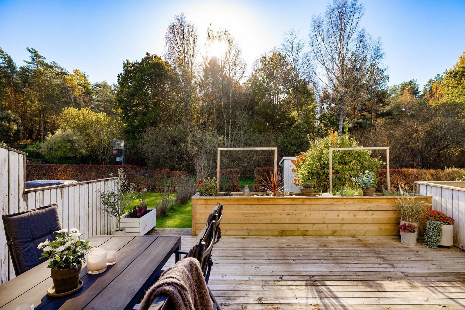 På Vårbäcksvägen 15B förbereder vi nu försäljning av ett fint renoverat radhus med ett av områdets bästa lägen. Här bor du fritt och insynsskyddat, med skogen som granne. Entréplanet är ljust och luftigt med fokus på öppna umgängesytor där kök, matplats och vardagsrum hänger samman i en rymlig sällskapsyta som sommartid växer när dörren ut till altanen och trädgården står öppen. Stora södervända fönsterpartier med låga bröstningar låter ljuset flöda in och gränsen mellan rum och natur suddas ut. Övervåningen är ett privat plan med fyra sovrum i bra storlek, klädkammare samt ett badrum, smakfullt renoverat och stambytt 2022. Från två av sovrummen nås en stor balkong med fin vy över skogspartiet. Dessutom erbjuder huset ypperliga förvaringsmöjligheter, och att badrummet kompletteras av en separat toalett och tvättstuga på entrévåningen är något som verkligen underlättar vardagslivet för en barnfamilj. Skicket är som sagt gott och huset har renoverats löpande genom åren, här är det bara att flytta in. Utanför väntar den egna trädgården, en av de fina sakerna med radhus där man kan kliva rakt ut i gräset, duka upp för fika och kalas eller ta en kopp kaffe i frisk luft. Även på husets framsida återfinns en trälagd uteplats tillsammans med ett större förråd.