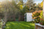 Mysig trädgård med fina gräsytor, buskar och planteringar, altandäck och redskapsbod. På husets framsida uteplats och förrådsbyggnad.