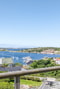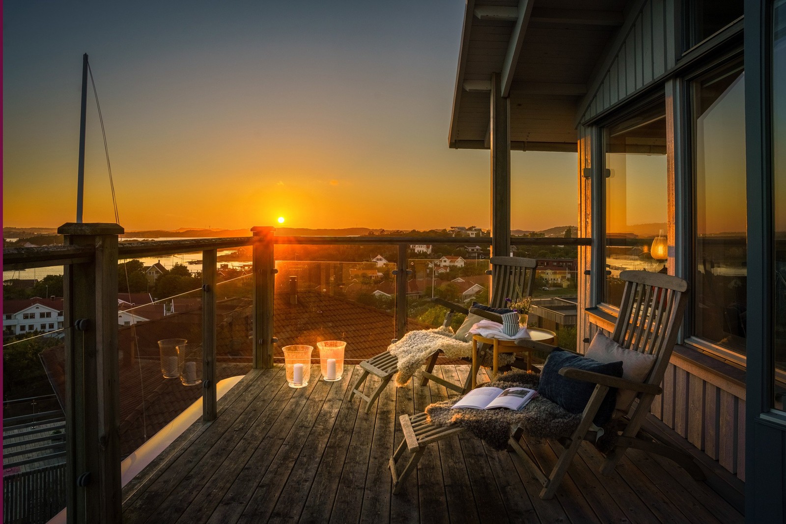 En altandörr leder ut till den stora terrassbalkongen med trägolv och räcken i glas och trä. Atmosfären här uppe är mycket speciell en sommarkväll. Luften är tung av blom- och havsdoft och drygt hundra meter ner slår stilla vågor mot stränder och bryggor. Du är tillräckligt nära för att betrakta livet i vikar och hamnar, men långt bort nog för att inte störas. Till vänster är det öppet hav där de stora fartygen syns vänta vid farleden. Till höger syns bland annat Lilla Varholmen och färjeläget.