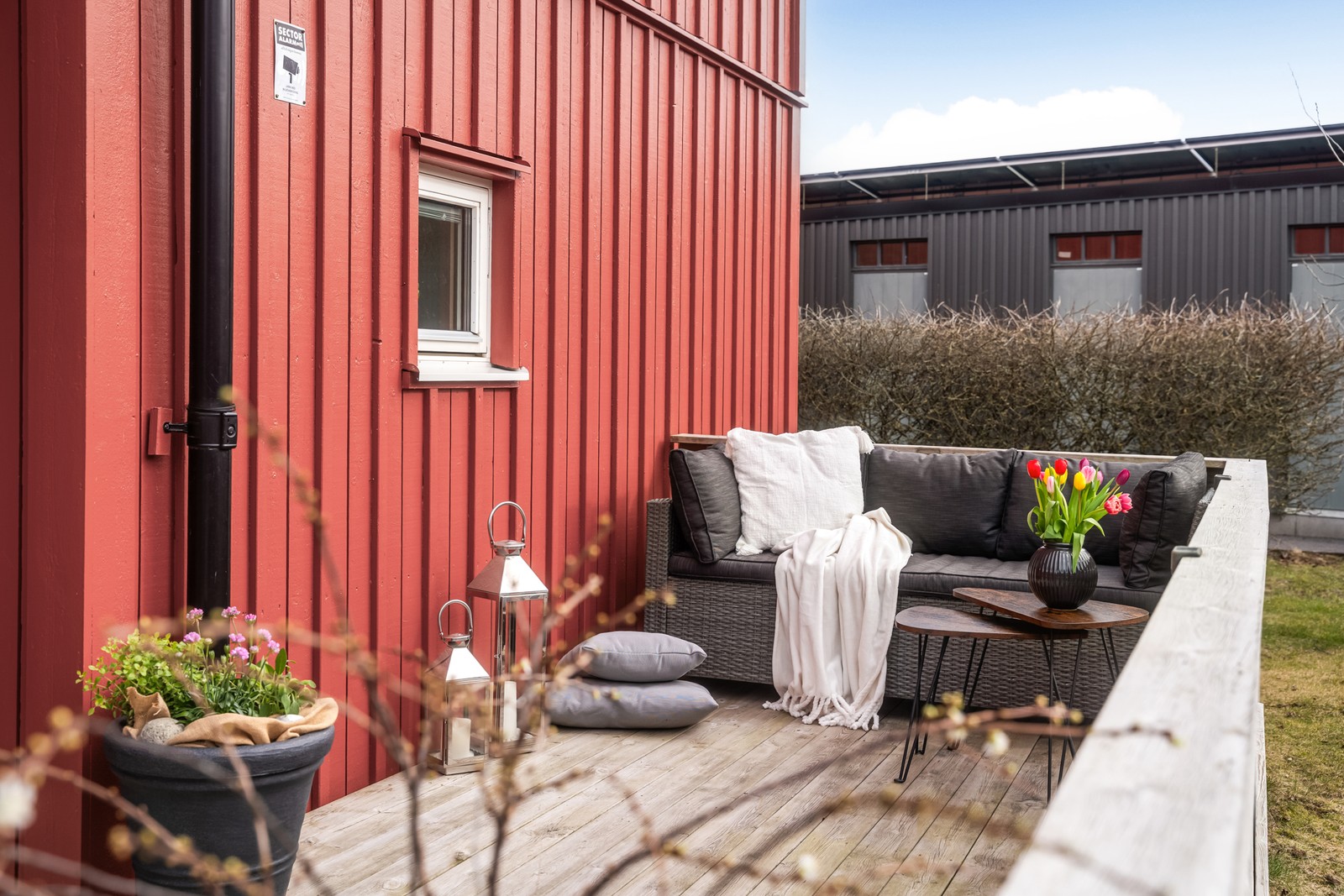 Mysigt boende med kvadratsmart planering och bekvämt på markplan med rymlig altan.