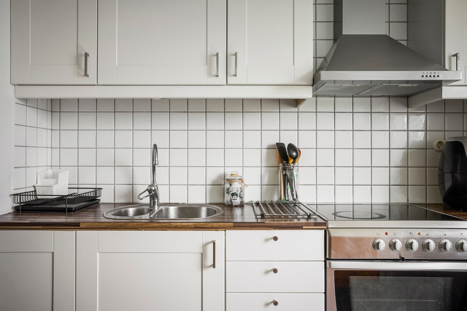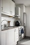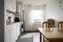 Till höger nås det rymliga köket i stilrent utförande med modern köksinredning. Vita luckor med vitt kakel ovan en laminatbänkskiva. Maskinell utrustning består av spis, fläkt samt kombinerad kyl och frys. Här ryms med enkelhet en matgrupp för 4 personer.