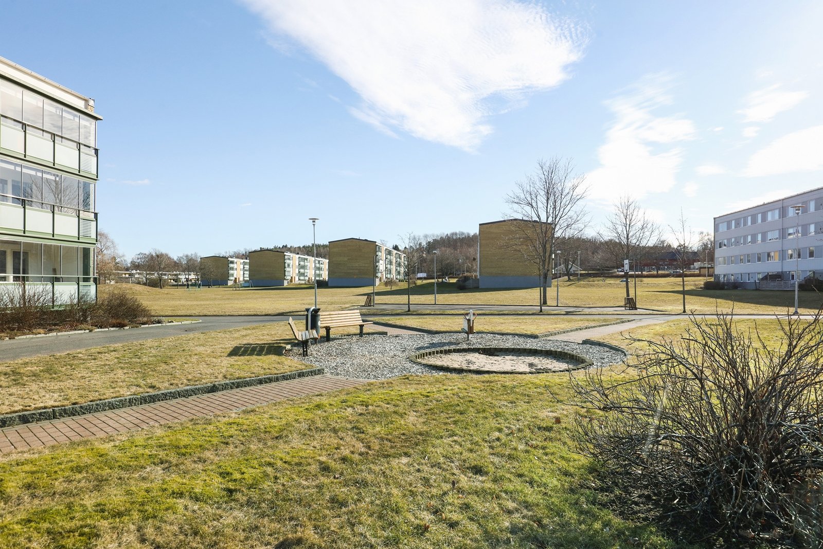 Mycket grönytor med sittplatser, grillplatser, lekplatser och pergolas bl.a.