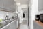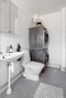 Från bostadens hall nås även en nyrenoverad gästtoalett i samma stilrena utförande som badrummet, med ljust kakel och grått klinkergolv, ett praktiskt och uppskattat komplement.