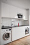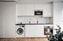 Några steg in i bostaden möts du utav det smakfulla köket som får hemmakocken att stormtrivas. Skåpinredning och luckor är tidlöst vita och bryts av mot en mörk laminatbänkskiva med ovansittande vitt kakel. Här finns gott om arbetsyta samt förvaringsutrymmen för kökets alla redskap. Den maskinella utrustningen består av ugn, inbyggd mikro, fläkt, spishäll, kombinerad kyl/frys samt tvättmaskin. Intill köket finns även en naturlig plats att inreda för matbord dukat till ca. fyra gäster.