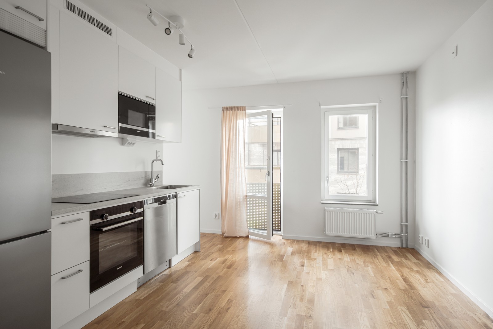 Vidare in i bostaden kliver du in i hemmets hjärta, det öppna köket och vardagsrummet. Här flödar ljuset från de stora fönstren som tillsammans med de ljusa väggarna och det vackra parkettgolvet skapar en luftig och trivsam atmosfär. Kökets ljusa och grå detaljer tillsammans med en laminatbänkskiva ger en modern känsla. Samtliga vitvaror är från 2023/24 och inkluderar ugn, induktionshäll, diskmaskin samt kombinerad kyl och frys. Från vardagsrumsdelen nås även en fransk balkong som ytterligare förstärker rymden.