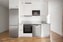 Intill hallen finns det helkaklade badrummet där grått klinker och vitt kakel förenas i en ljus och harmonisk färgsättning. Taket följer samma stil och skapar ett enhetligt helhetsintryck. Här finns även en praktisk kombimaskin för både tvätt och tork, kommod och spegel med belysning.