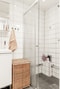 Badrummet, som nås från hallen, är helkaklat i ljusa kulörer. Här finns en rymlig duschhörna samt wc, handfat med ovansittande spegelskåp och handdukstork. Trivselfaktorn höjs ytterligare av den komfortabla golvvärmen.