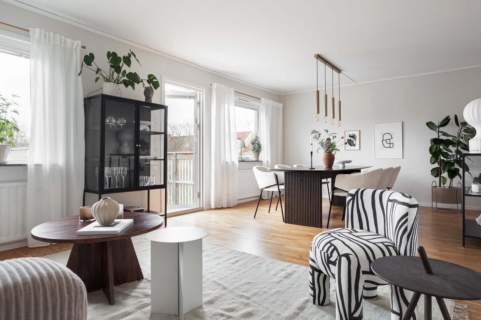Middagarna kan ni med fördel äta i matsalsdelen som smidigt nås från köket. I matsalen får det större matbordet plats. I den bortre delen av rummet finns det rum för soffgruppen. Från vardagsrummet når ni balkongen som via trappan ned blir till altan. Från balkongen och altanen har ni fin och fri utsikt mot lekplatsen och den öppna ytan mellan husen.