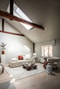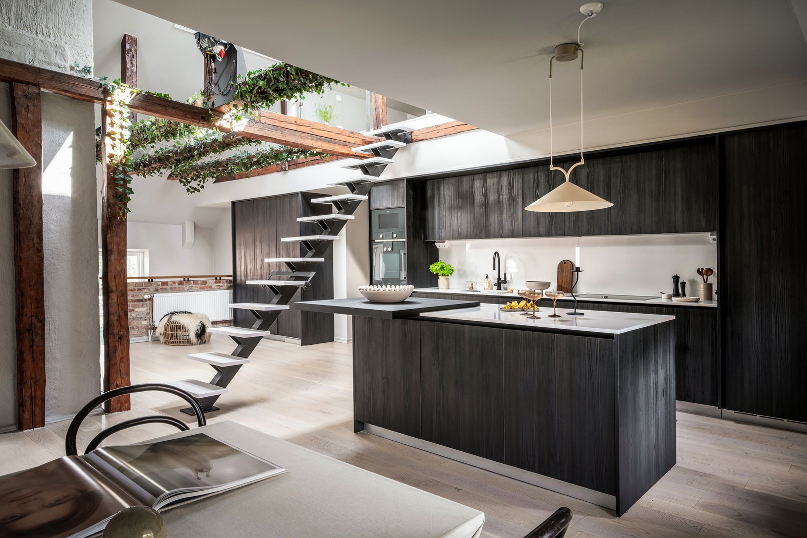 Till höger, i öppen planlösning med matsal och kök, ligger våningens ljusa sällskapsytor. Arkitekturlinjerna reser sig brant upp till nock, inramade av synliga reglar och bjälkar som är mörkbetsade. Intrycket ihop med tegelstommarna och den centrala murstocken är slående. En höstkväll, när regnet smattrar mot takfönstren, sprakar veden i den formrena kaminen. En sådan kväll skapar de stora ytornas belysning en fantastisk atmosfär.
