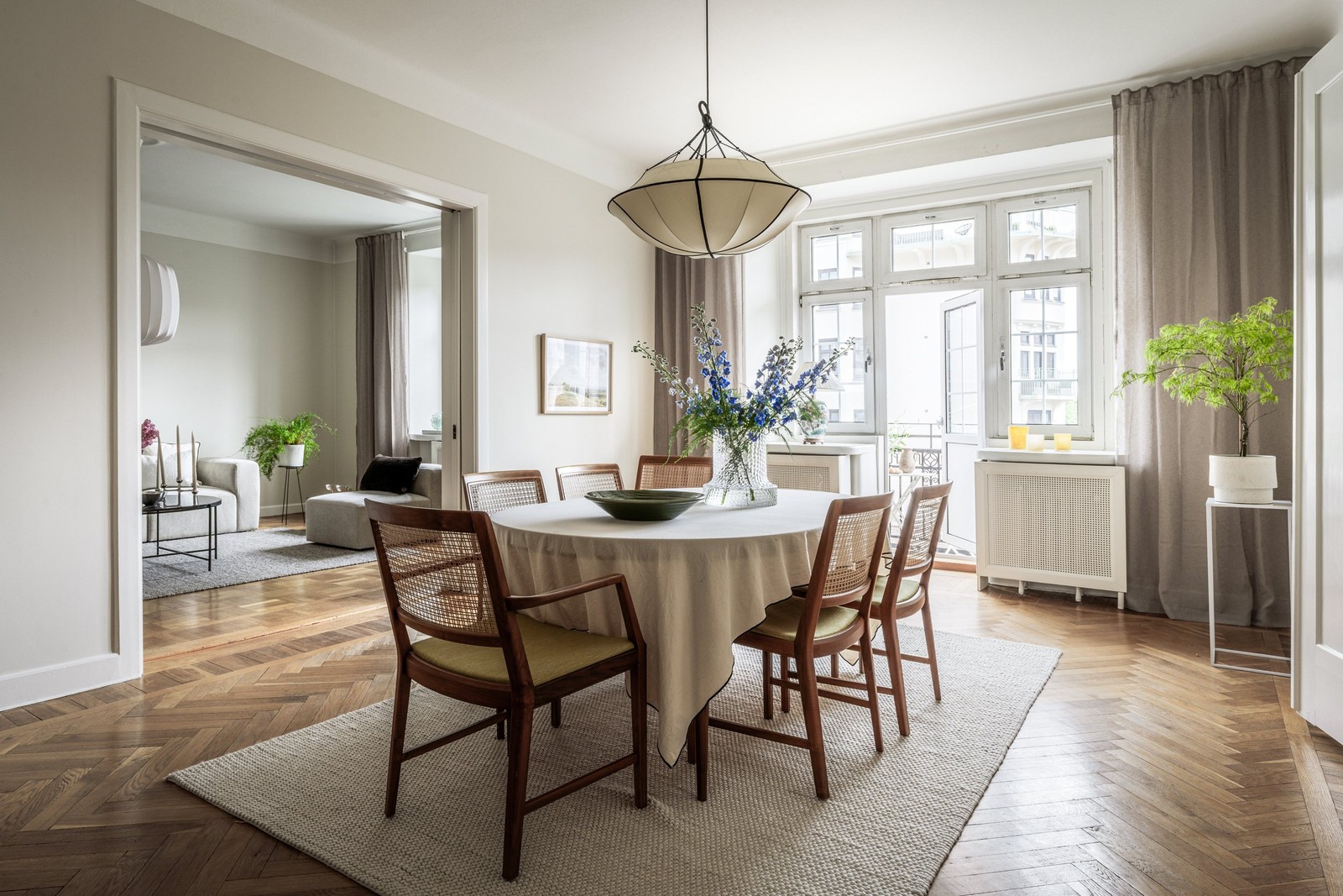 Stor paradvåning med 1910-talets ljusa salonger och originaldetaljer – högt över grönska och folkliv