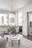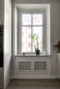 Vidare in i bostaden kommer ni till vardagsrummet. Golv och väggar löper enhetligt och tröskelfritt vidare i samma färger. Taket är klätt med pampiga stuckaturer och en fin takrosett. Sällskapsytorna upplevs otroligt ljusa och trivsamma tack vare de stora fönsterpartierna ut mot gården. Plats finns åt såväl soffgrupp som TV-möbel.