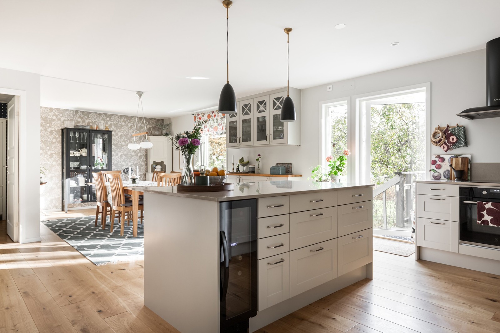 Kök: Rakt fram finner vi köket som man öppnat upp och gjort ljus och rymligt. Här finns en stor köks-ö och gott om plats för matlagning och umgänge. Snickerierna går i sandfärgat med arbetsbänkar i kompositmaterial. Matbordet har sin givna plats i matsalen som har god kontakt med köket. Här finns en dörr ut till altanen.