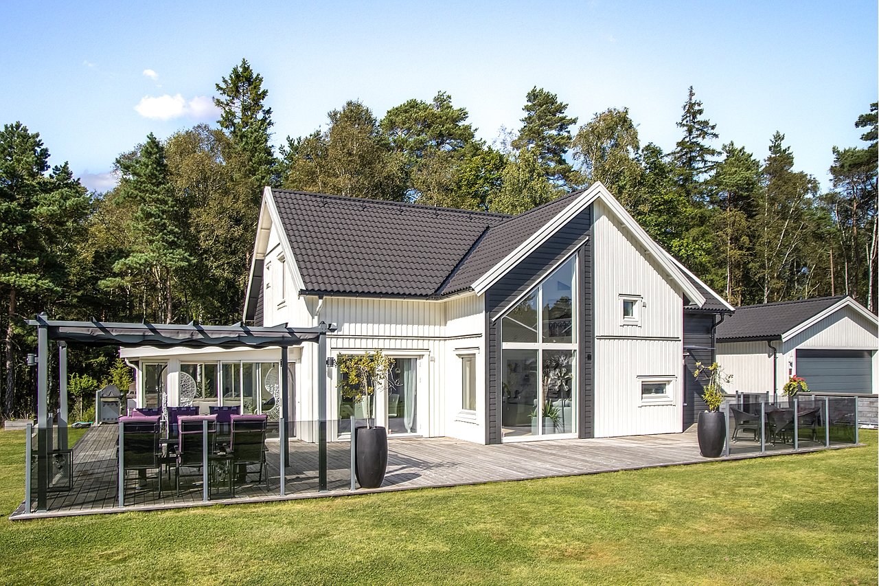 Utomhus finns flera härliga ytor att njuta av. Uterummet ger dig möjlighet att uppleva utomhuslivet även när vädret inte är perfekt, samtidigt som du är skyddad från regn och vind. Altanen inbjuder till soliga dagar och grillkvällar, medan gräsmattan erbjuder plats för lek eller lugna stunder i det gröna. Den andra altanen i västläge fångar eftermiddagssolen och blir en naturlig samlingspunkt senare på dagen.
