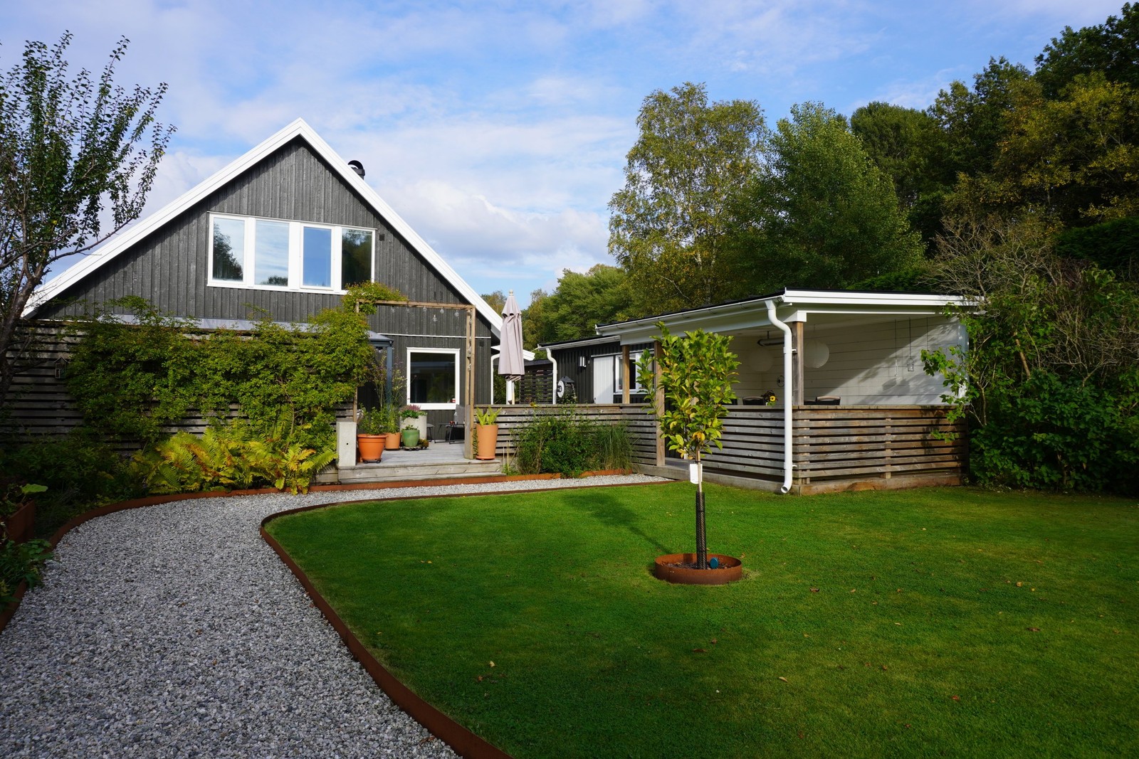 I den vackra och välskötta trädgården finns en stor berså och en grusgång som skapar en inbjudande plats för umgänge och avkoppling. Trädgården pryds av fruktträd, grönska och blomsterprakt som ger en harmonisk och trivsam miljö.