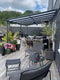Den stora altanen blir en naturlig förlängning av vardagsrummet under sommarhalvåret. Här finns delvis tak, vilket ger möjlighet att njuta av utemiljön oavsett väder. Altanen rymmer både loungemöbler och matgrupp.