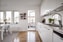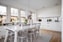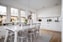 Det rymliga köket är stilrent utformat med vita högblanka luckor, vit laminatbänkskiva och glasskydd ovan arbetsytorna. Här finns gott om arbetsyta och förvaring samt komplett maskinell utrustning med kyl, frys, inbyggnadsugn och mikro, diskmaskin, spishäll och köksfläkt. Den generösa matplatsen rymmer enkelt 8–10 gäster och blir en naturlig samlingspunkt i hemmet.
