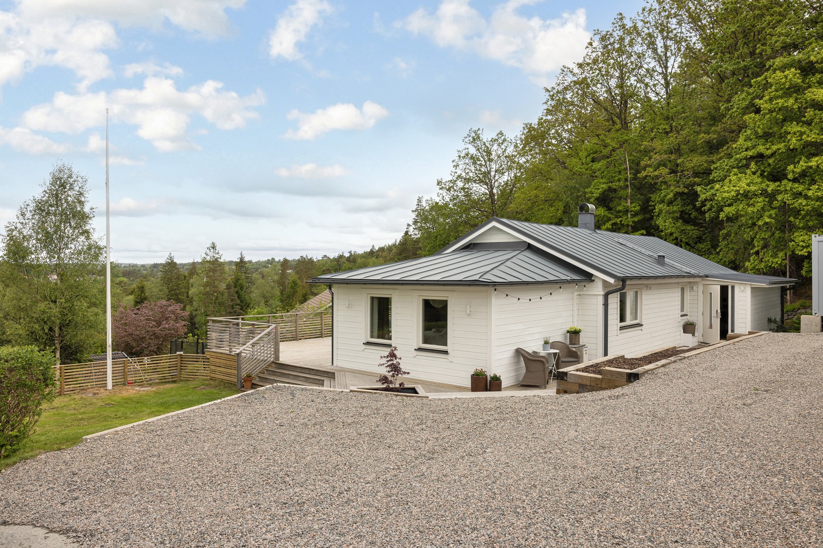 Runt huset löper en generös altan på hela 105 kvm – här finns plats för både grillkvällar, lekytor, odlingar och lugna stunder i solen från morgon till kväll. Följ solen, flytta runt sittgrupperna och njut av naturen precis utanför.