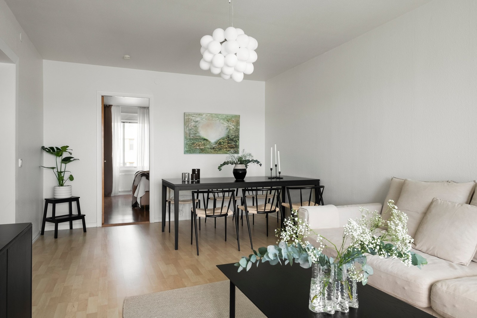 Vardagsrummet är rymligt och inbjudande, perfekt för umgänge med nära och kära. Här finns gott om plats för en större soffgrupp, soffbord, mediamöbel och även en matgrupp för den som önskar. Det generösa ljusinsläppet och den trevliga takhöjden skapar en luftig och trivsam atmosfär, en känsla som genomsyrar hela bostaden. Från vardagsrummet nås den inglasade balkongen med ett perfekt solläge och plats för en större loungegrupp.