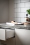 Från hallen nås det genomtänkta och påkostade köket från Ballingslöv som renoverades i samband med bostadens totalrenovering 2023. För att skapa en mer social och funktionell yta har väggar flyttats, vilket möjliggjort både en rymligare matplats och plats för en fullstor kyl respektive frys. Köket präglas av ljusa nyanser och en elegant stenskiva i bohusgranit som arbetsbänk, vilket tillsammans skapar ett stilrent och gediget intryck. Här finns även praktiskt installerad ugn och kombinerad ugn/mikro i bekväm arbetshöjd samt gott om förvaring och arbetsytor.