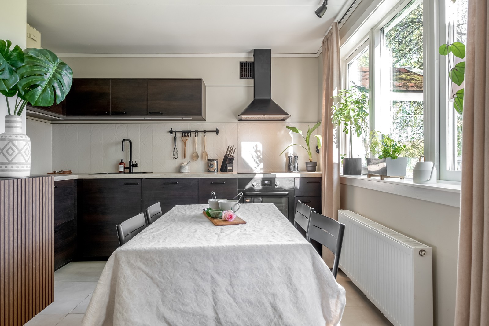 Husets nedre plan bjuder på en öppen och inbjudande planlösning med ett stilrent kök och ett rymligt vardagsrum med plats för både soffhörna och matgrupp. Från vardagsrummet når du den soliga uteplatsen – en perfekt plats för grillkvällar, odling eller bara skönt uteliv under årets varmare månader.