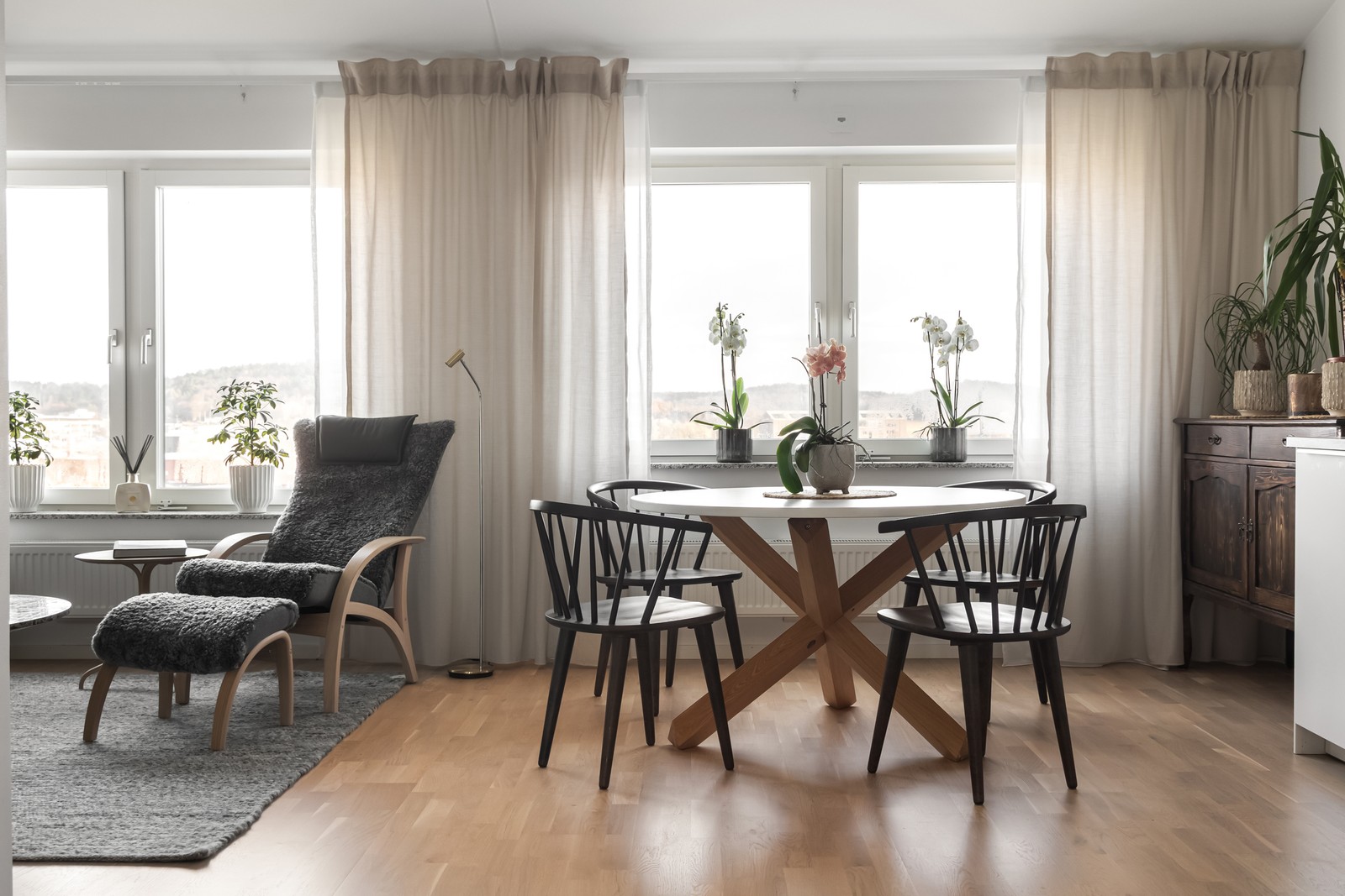 Vardagsrummet är bra planerat med plats för soffgrupp, soffbord. Rikligt med ljusinsläpp från ett flertal fönster bidrar till en känsla av rymd.